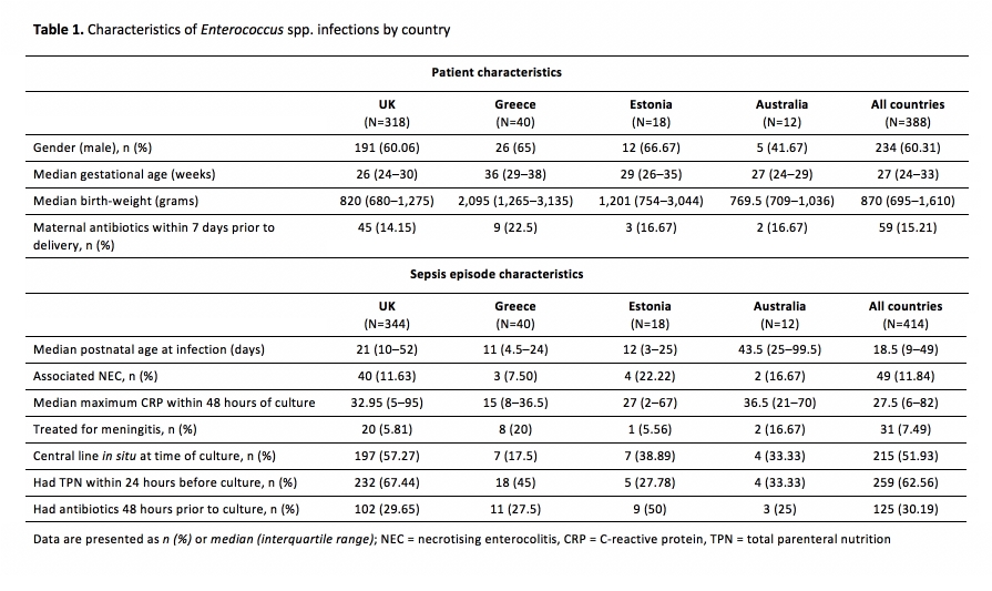 RESULTS: 414 enterococcal infections were reported in 388 infants (total of 4,083 infection episodes in 3,602 infants). Enterococci were the 2nd most common cause of late-onset infection (385/3,481 isolates). Table 1 presents enterococcal infection characteristics by country. On multivariate analysis, compared to other infections, enterococcal infections occurred at a greater median postnatal age (18.5 versus 13 days, p<0.001), and were strongly associated with NEC (OR 1.50, 95%CI 1.08-2.10, p=0.017). Antimicrobial susceptibilities were available for 288/416 (69%) enterococcal isolates. There was low resistance to vancomycin (3%) and teicoplanin (4%), but high resistance to ampicillin (17%) and gentamicin (38%).