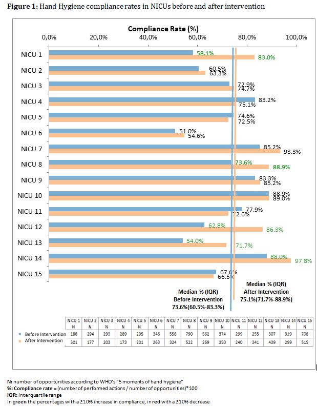 RESULTS: A ≥10% increase in HH compliance rates was detected in five units, compared to the pre-intervention period. In no units was a decrease of ≥10% detected. The median (IQR) post-intervention HH compliance rate was 75.1%(71.7%-88.9%) while the median pre-intervention rate was 73.6%(60.5%-83.3%)(Figure 1). Stratified by type of professional, a ≥10% increase in HH compliance rates among doctors was observed in 5 NICUs and a decrease of ≥10% in only one. Similar results were found for nurses.