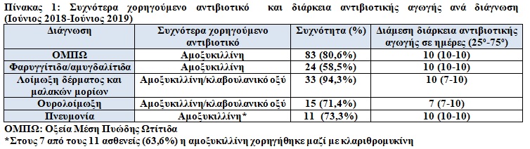 Αποτελέσματα: Συνολικά καταγράφηκαν 215 συνταγογραφήσεις αντιβιοτικών (πίνακας 1) εκ των οποίων 141 (65,5%) ήταν σε κορίτσια. Σε περιπτώσεις με ΟΜΠΩ (103/215, 47,9%), το πιο συχνά συνταγογραφούμενο αντιβιοτικό ήταν η αμοξυκιλλίνη (83/103, 80,6%), ενώ η διάμεσος διάρκεια της αντιβιοτικής αγωγής ήταν 10 ημέρες (IQR:10-10). Σε περιστατικά με φαρυγγίτιδα/αμυγδαλίτιδα (58,5%), η αμοξυκιλλίνη συνταγογραφήθηκε σε 24 από τα 41 και η διάμεση διάρκεια αντιβιοτικής αγωγής ήταν 10 ημέρες (IQR:10-10). Τέλος, σε λοίμωξη δέρματος και μαλακών μορίων (33/35, 94,3%), η αμοξυκιλλίνη/κλαβουλανικό οξύ ήταν το πιο συχνά συνταγογραφούμενο αντιβιοτικό με τη διάμεσο διάρκεια της αντιβιοτικής αγωγής να ήταν 10 ημέρες (IQR:7-10).