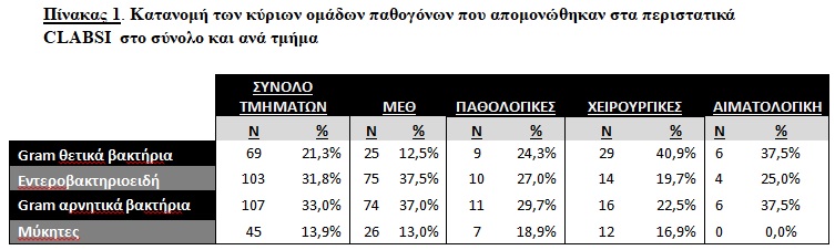 Αποτελέσματα: Στο σύνολο των τμημάτων καταγράφηκαν 265 περιστατικά CLABSI σε 235 ασθενείς και απομονώθηκαν 324 παθογόνα. Κατά φθίνουσα συχνότητα απομονώθηκαν Gram αρνητικά βακτήρια (33%), Εντεροβακτηριοειδή (31,8%), Gram θετικά βακτήρια (21,3%), Μύκητες(13,9%). Τα παθογόνα που απομονώθηκαν πιο συχνά ήταν: Klebsiella spp[71(21,9%)], Acinetobacter spp[65(20%)], Candida spp [44(13,6%)], Enterococci spp[32(9,9%], Pseudomonas aeruginosa[28(8,6%)]. Η κατανομή των κύριων ομάδων παθογόνων που απομονώθηκαν στα περιστατικά CLABSI στο σύνολο και ανά τμήμα φαίνεται στον Πίνακα 1. Στις χειρουργικές κλινικές πιο συχνά παθογόνα ήταν τα gram θετικά βακτήρια (40,9%), εκ των οποίων το 62,1% ήταν Staphylococcus aureus. Στις ΜΕΘ συχνότερα ήταν τα gram αρνητικά βακτήρια (37%) με κυρίαρχα στελέχη το Acinetobacter spp (59,5%) και τη Pseudomonas aeruginosa (29,7%) και τα εντεροβακτηριοειδή (37,5%) με το 72% αυτών να είναι Klebsiella spp. Στις Παθολογικές κλινικές η κατανομή ήταν παρόμοια με σαφώς μεγαλύτερο ποσοστό Acinetobacter spp (90,9%) στα gram αρνητικά βακτήρια. Τέλος, στην Αιματολογική κλινική, τα πιο συχνά παθογόνα ήταν: Klebsiella spp, Enterococci spp, Pseudomonas Aeruginosa σε ποσοστό 18,8% έκαστο και ακολουθούν οι Coagulase negative Staphylococci (12,5%).
