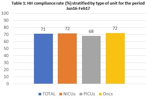 RESULTS: A total of 6472 HH opportunities were observed.The total HH compliance rate was 71% and did not differ by unit type.The rate of appropriate HH was 52%(Table 1).The response rate among 749 HCWs from all units was 48%.Since the actual number of HCWs receiving the questionnaire was not available. Response rate is underestimated.Emergency situations(73%), distraction from other responsibilities necessary for patient care(47%), heavy workload(34%), skin irritation from hand products(24%) were the most frequent answers.Almost half of the responders did not participate in any HH educational activity during the previous year.