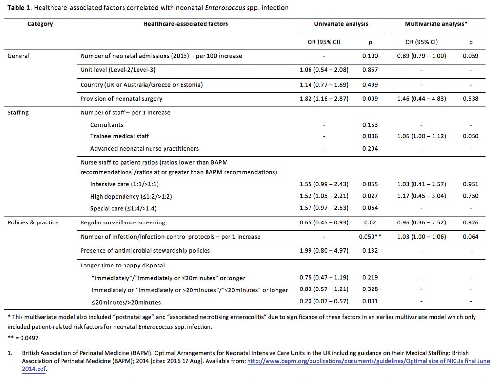 RESULTS: 24 of 60 units (40%) responded to the survey, of which 21 were Level-3 (NICUs). Table 1 shows the influence of various healthcare-associated factors on the risk of enterococcal versus other infections. An increasing number of trainee medical staff was associated with an increased risk of enterococcal infection (per 1 increase: OR 1.06, 95% CI 1.00-1.12, p=0.050) while the ratio of nurse:patient did not have any significant influence.