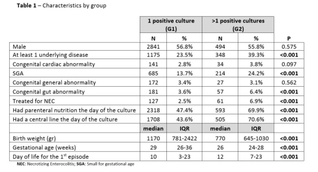 RESULTS: We identified 5895 infants, of which 885(15%) with recurrent positive cultures. Neonates with a single-positive culture(G1) had a higher median birth-weight (p<0.001), a higher median gestational-age (p<0.001), were less likely to have received parenteral-nutrition (p<0.001) and to have a central-line present on the day of the culture (p<0.001) compared to the recurrent group (G2). The median day of life for the 1st episode was 10 days(IQR:3-23) vs 12 days(IQR:7-23) (p<0.001) for G1 and G2 respectively. G2 neonates were more likely to have at least one underlying disease 39.3% vs 23.5% (p<0.001). Specifically, they were more likely to be SGA, have congenital gut abnormalities, and been treated for NEC compared to G1. (Table 1) The most commonly isolated pathogen for both groups were CONS (including S.capitis, haemolyticus, warneri and hominis) at 53.3% for G1 vs 59.1% for G2.