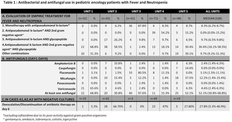 RESULTS: Among 258 FN episodes, initial empiric therapy was monotherapy in 50 cases (19.3%).In 34% of all FN cases an antipseudomonal b-lactam with a second gram-negative agent and a glycopeptide was administered. There was variability in antibiotic and antifungal use among the units(Table 1). 45.7% of the cases received at least 1 antifungal agent within the first 4 days of the course. The median rate of de-escalation/discontinuation of antibiotic therapy on the 6th day in cases with negative cultures was 27.8%(IQR: 5.3%-46.9%)(see table 1).