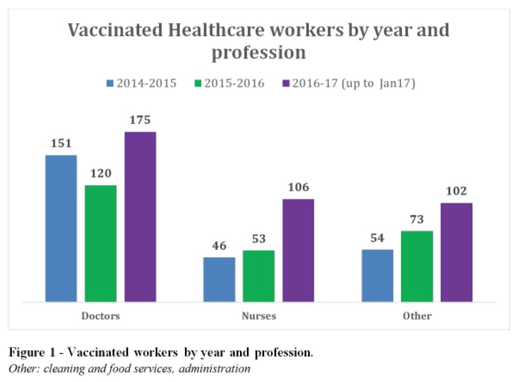 RESULTS: Our 2015 survey identified 3 main findings: a. Non-vaccination rates were significantly higher among nurses (75.7%) and cleaning/food service workers (72.7%), compared to doctors (40%)(P<0.001). b. Misconceptions and concerns regarding vaccine side-effects (40.1%) and ineffectiveness (26.6%) were common; and c. Less than half of HCW (48.7%) stated that they had enough information about where and when they could get vaccinated at the hospital. In January 2017, the hospital’s vaccination rate was at 30.8% - much higher than previous years of around 19%. The vaccination increased in all types of HCW with a considerable 2-fold increase of vaccinated nurses (Figure1).