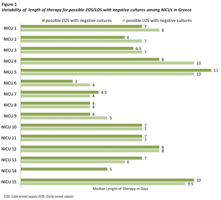 RESULTS: 1330 cases of possible EOS were recorded with a median LOT of 7 days(IQR:5-7.5). Median LOT, at the unit with the lowest value, was 3 days(IQR:2-4) while at the one with the highest 11(IQR:9-15). 260 cases of possible LOS were identified with a median LOT of 7 days (IQR:5-7.5). Median LOT, at the unit with the lowest value, was 4 days (IQR2-5) while at the one with the highest 10(IQR6-13). Median antibiotic consumption was: a)glycopeptides 2.7%(range:0-12.6%) for EOS and 21.7%(range:8.8%-34.8%) for LOS. b)meropenem 0.4%(range:0-4.8%)(EOS) and 8.6%(range:0-16.8%)(LOS), c)cefotaxime 1.2%(range:0%-12.5%)(EOS) and 2.2%(range:0-26.8%)(LOS)