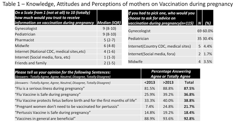 RESULTS: 154 mothers of a median age of 33 years(IQR:28-37) responded to the questionnaire and 47.7% had a higher education. 125(81.2%) have given birth after 1/1/2013 and 14(11.2%) were vaccinated for flu and 1(0.08%) for pertussis. Most frequent reasons given for non-vaccination for flu and pertussis respectively, were a)unawareness (54.4%,84.8%); b)safety(34.4%,8.8%) c)their gynecologist advised them not to (13.6%,8%). Even though the majority (92.8%) believes that vaccines are beneficial, only 36.8% believe that flu vaccination is safe during pregnancy and 18.4% for pertussis with higher rates among mothers who gave birth after 2013(Table1)