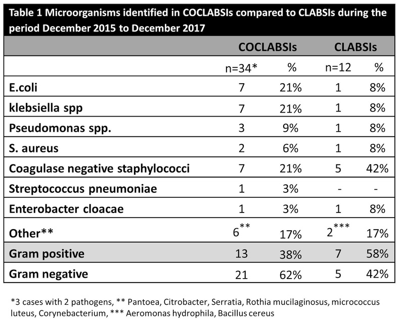 RESULTS: Thirty-one COCLABSIs cases were identified with a median hospitalization duration of 10days(IQR: 6-11) and a median antibiotic course of 10 days(IQR: 10-10). The infection resulted in a delay in chemotherapy in 8/29(27.6%),catheter removal in 4/31(12.9%) and 1 patient 1/31(3.2%) required ICU admission. No deaths were recorded. During the same period,12 CLABSIs occurred in the hospital. Pathogens isolated are shown in Table1. Gram negative organisms were responsible for the majority COCLABSIs in contrast to CLABSIs which were caused predominately by Gram positive.