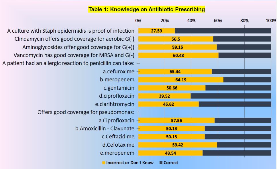 RESULTS: The survey had a response rate of 60.3% (375/622). 71.5% had never heard the term Antibiotic Stewardship. 55% answered correctly to half or fewer of 14 questions on antibiotic prescribing (Table1). The majority failed to identify that vancomycin (59%) and clindamycin (57.8%) do not have good coverage for gram-negative bacteria. Students could not identify as inappropriate antimicrobials for an ESBL infection: amphotericin-B (84.3%), vancomycin (85.1%), linezolid (93.4%), or ceftriaxone (40%).Only 16% would prescribe amoxicillin to a fully immunized thirteen-year-old with community-acquired pneumonia. Throughout medical school respondents had been asked fewer than 5 times or not at all to choose: whether an antibiotic was needed (57.3%); the right antibiotic (48.5%); route, dose, and interval (71.2%); duration (62.3%); or the agent based on the culture results (67.4%). Self-reported confidence on 15 items regarding antimicrobial prescribing (on a scale from 1[not at all] to 10[totally]) was a mean of 6.28/10.